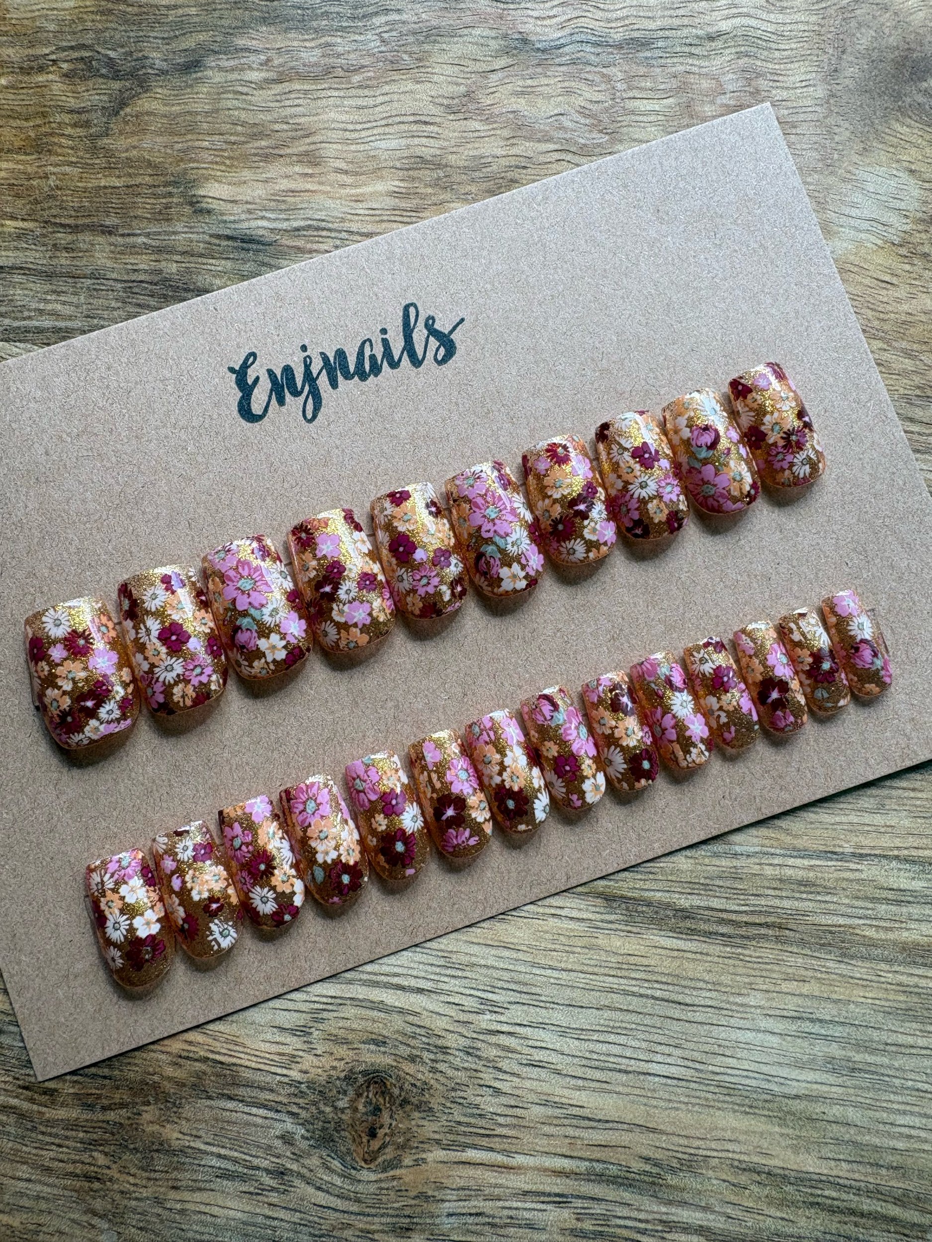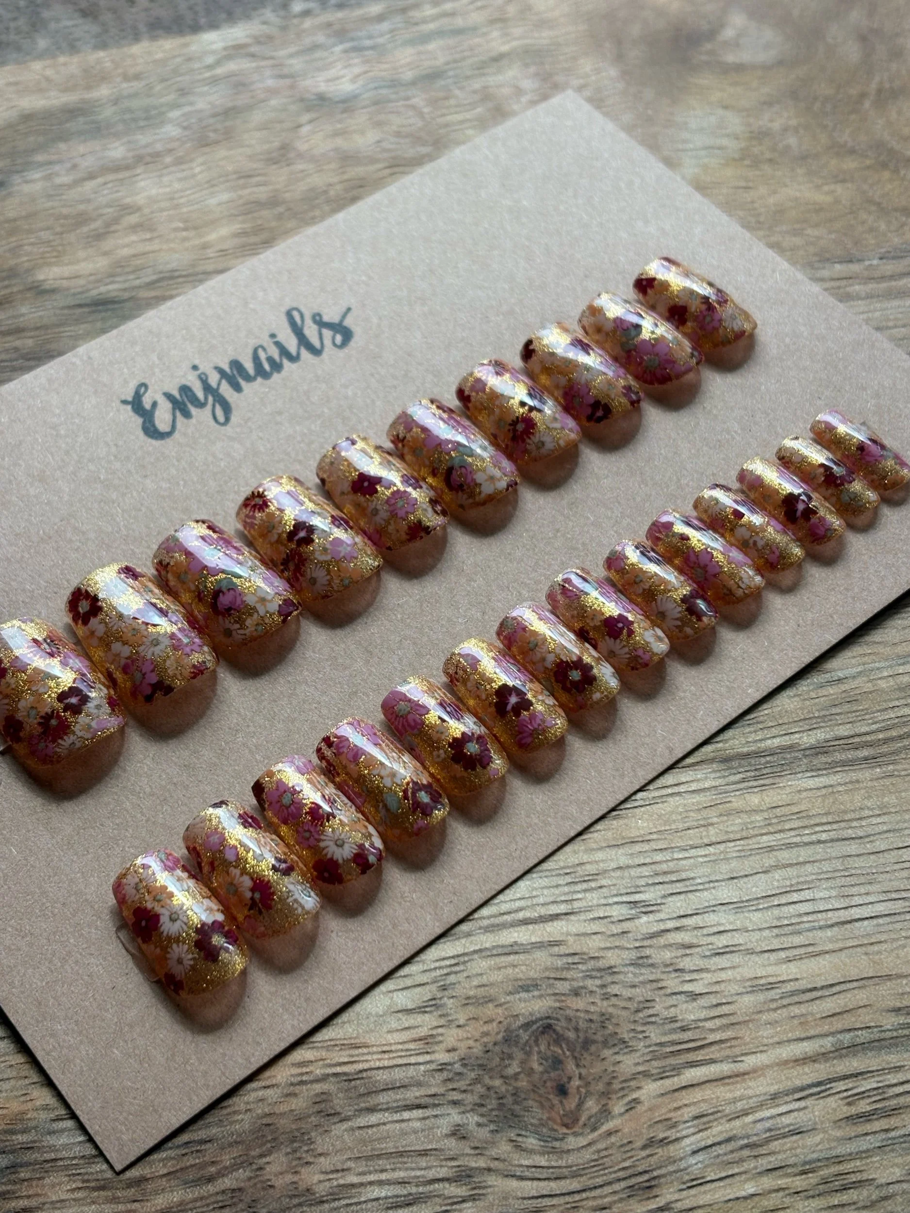 This set features a glittery gold base, that is slightly transparent, and floral designs
